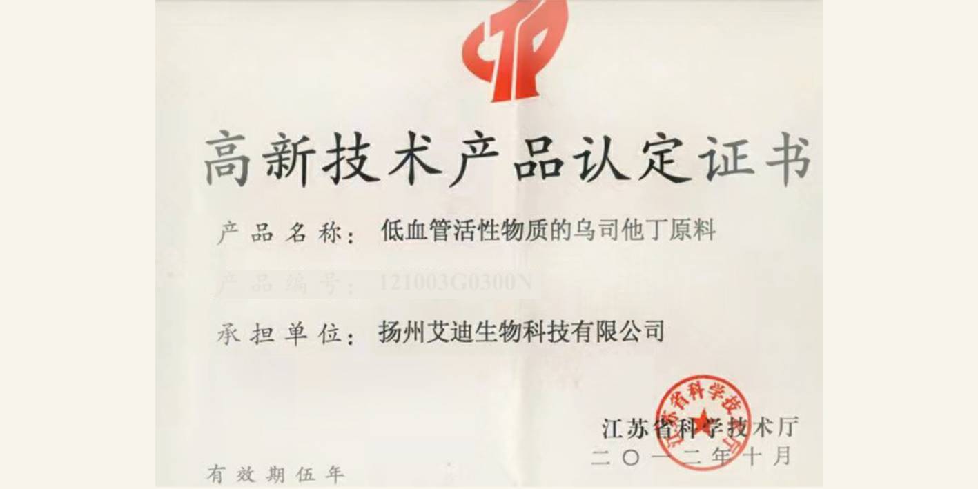 • 低血管活性物质的乌司他丁原料获得2012年江苏省高新技术产品认定