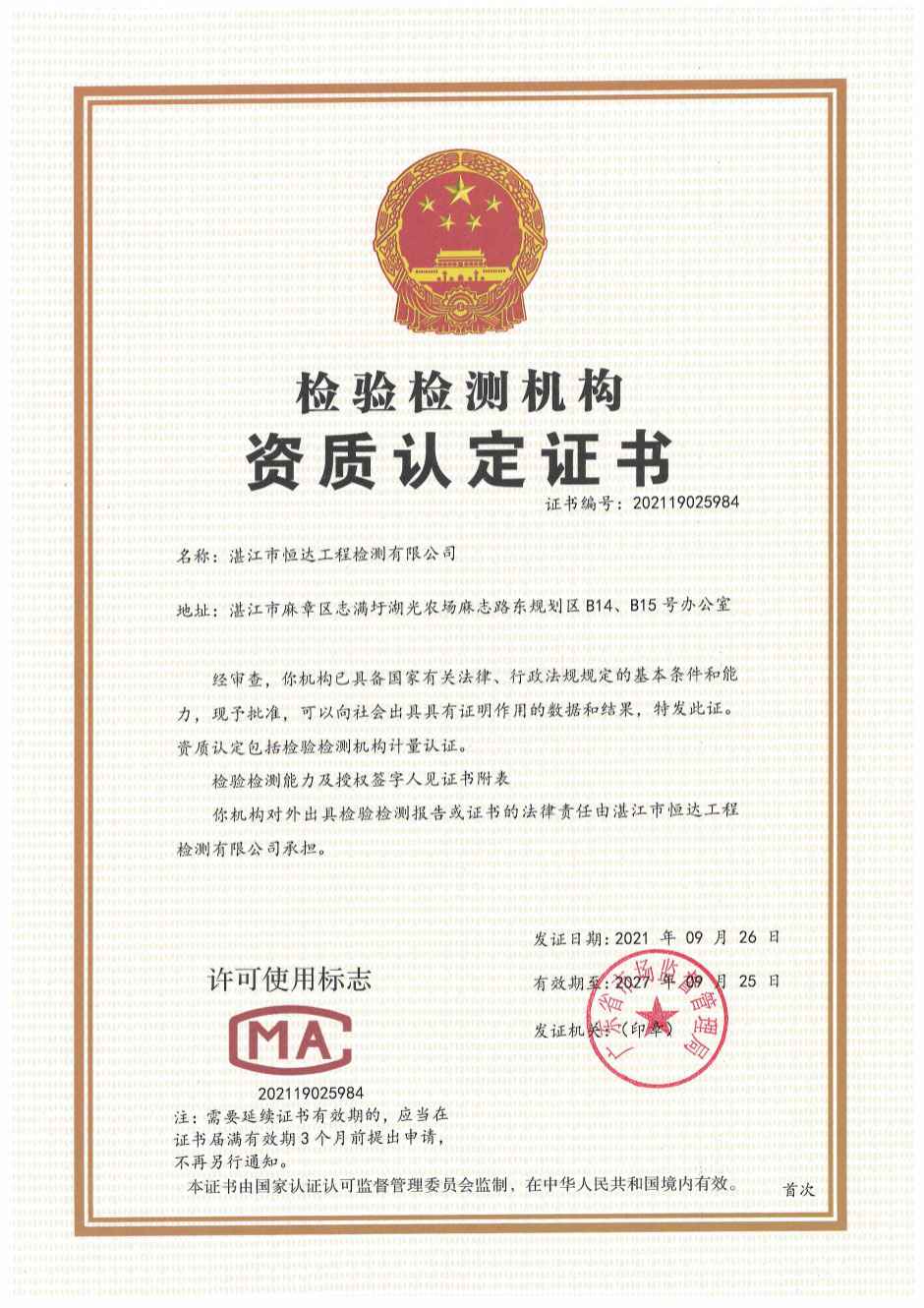 于2020年8月成立于湛江市。公司检测范围广,类别多,基本涵盖了房屋建筑和市政基础设施工程的全部领域(工程材料、工程实体、工程环境),2 个领域具备 17 个类别 1241 个参数的检测能力。主要检测业务包括:建设工程质量及建筑材料检测;主体结构工程现场检测;钢结构工程检测;地基基础工程检测;建筑幕墙工程检测;建筑物室内环境检测;建筑节能检测;建筑结构检测鉴定等。